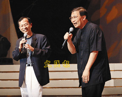 ■譚sir及曾鈺成在民建聯15周年晚會上表演棟篤笑,笑談民建聯點滴。 資料圖片