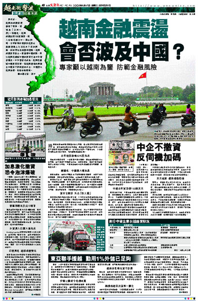 【本報訊】(記者 荊才、北京新聞中心記者李雪穎)受越南金融動盪衝擊,近年積極進軍越南的中資企業也受影響,需面對資金和原材料等成本上漲的壓力,有公司表示會審慎考慮對越南投資。不過,大部分中資公司皆表示不會撤資越南,反要伺機加大對越投資。