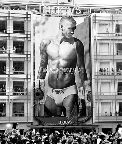 前曼聯和皇馬球星「萬人迷」碧咸為Emporio Armani推出的新內褲廣告做「代言人」。他前日在三藩市Macy's百貨公司出席簽名會,背景是他的巨型性感內褲海報,引起在場眾多「女粉絲」瘋狂尖叫。