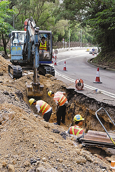 【本報訊】沙田及灣仔昨日先後發生爆水管事件,其中穗禾路地底一條直徑45厘米食水管爆裂後,引致大量食水湧出路面,警方到場需封鎖1條行車線,改作雙程單線行車,水務署工程人員趕至關上水掣,並掘路進行維修,其間多個屋苑暫停食水供應,水務署安排水車及水箱,為受影響居民提供臨時食水。至於灣仔的爆水管意外,一度令入海隧交通嚴重擠塞。