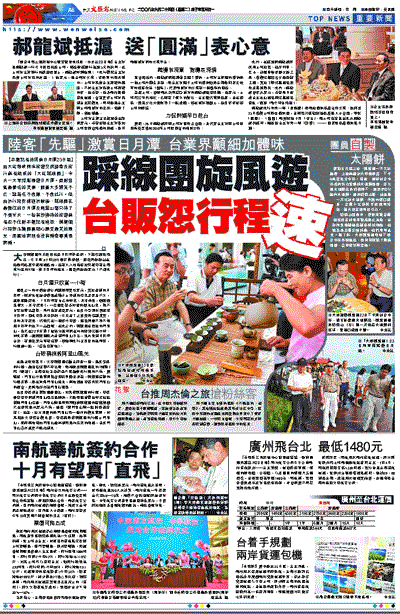 【本報記者林澤勇日月潭23日電】由大陸海峽兩岸旅遊交流協會及旅行業者組成的「大陸踩線團」,今天一大早搭船暢遊日月潭。面對寶島最著名的美景,團員大多讚賞不已,認為名不虛傳,不虛此行。但由於行程安排過於緊湊,踩線團在最嚮往的日月潭及阿里山都只待了不到半天,一些有份接待的旅遊業者忍不住對本報記者抱怨,稱這個行程無法讓團員細心感受最美的風光,而當地商販也沒有機會尋覓到商機。