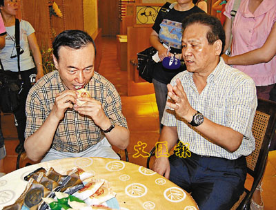 ■大陸旅遊踩線團23日下午來到台中市,被安排參觀太陽餅店,踩線團團長范貴山(左)第一次品嘗太陽餅的滋味,覺得口感很不錯。 中央社