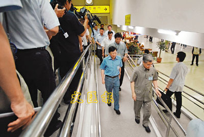 ■劉兆玄(中)日前到台北松山機場巡視。 中央社