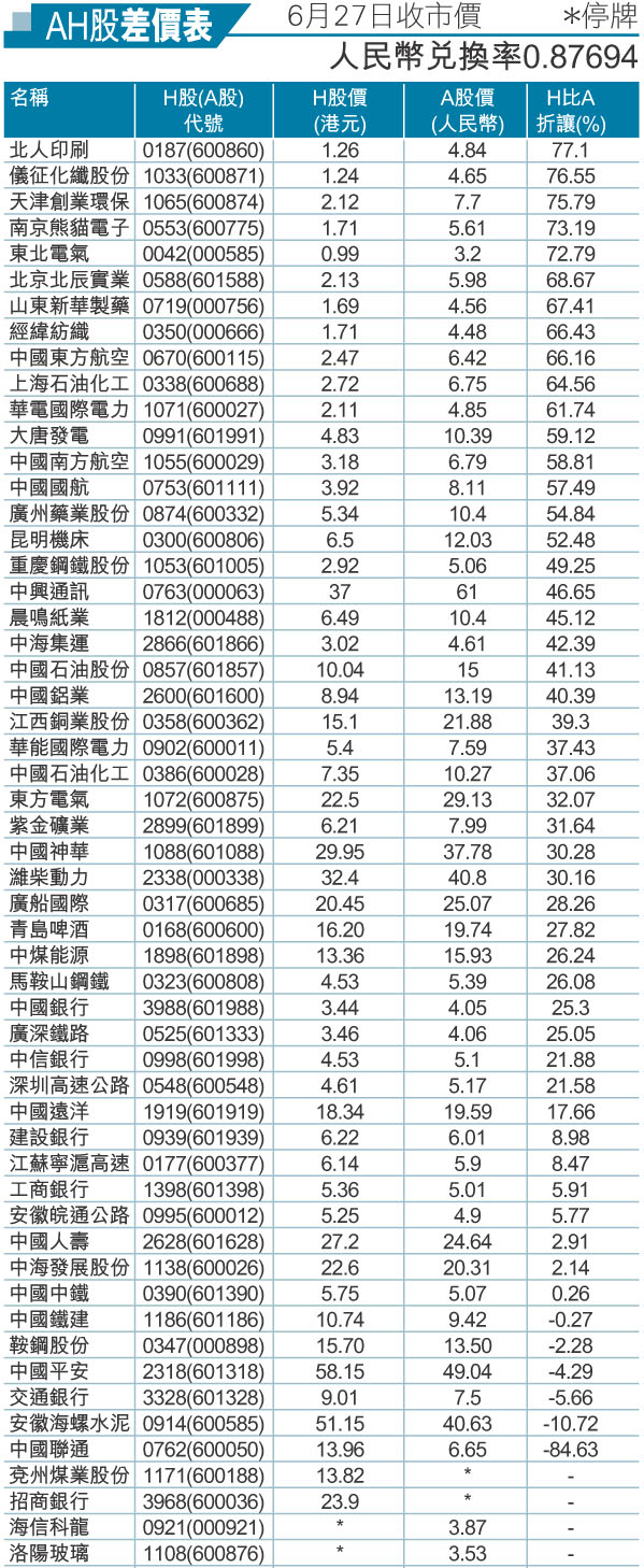 AH股差價表 6月27日收市價 (圖)