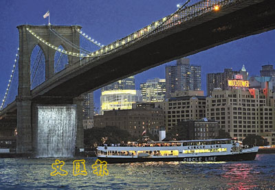 丹麥藝術家埃利亞松的最新傑作—4座巨型人工瀑布昨天亮相。瀑布高30至40米,分別位於布魯克林大橋下的船舶停泊點、布魯克林4號和5號碼頭之間、曼哈頓橋附近的35號碼頭和總督島。遊客只需花至少10美元(約78港元),就可乘船觀光30分鐘。 美聯社/路透社/法新社