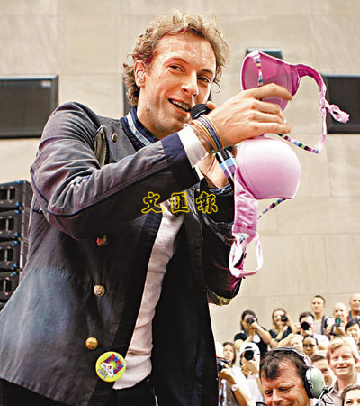 新碟於全球十多個市場獲得冠軍的Coldplay,前天現身紐約市進行宣傳,那可是NBC電視台節目《Today》相當有名的戶外演出環節。身為影后桂莉芙的丈夫,樂隊主音Chris Martin又唱又跳還手舞足蹈,投入程度足以拿滿分,忽然有歌迷把一個粉紅色胸圍投到台上,讓這位好好先生頓時有點不知所措,難道是怕老婆大問興師之罪? ■文:哈樂/圖:美聯社