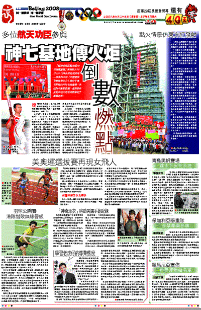 遼闊的大漠戈壁,載人航天發射塔架巍峨聳立,塔架正面的巨型紅色條幅上寫著「喜迎奧運 決勝神七」8個大字。