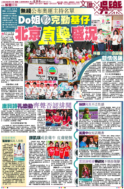 克勤表示將會與Do姐齊齊到北京主持奧運開幕禮,感到無上光榮。他謂雖然96年曾與劉德華一齊做過奧運主持,但今次在自己地方舉行,感覺特別不同。剛為人父的他,對於要與兒子分別一段時間,克勤笑說:「唔捨得都要捨得,自己地方搞咁難得。」快將卸任港姐的張嘉兒,卸任後首個工作就是主持奧運,她表示首要任務是要學好普通話。