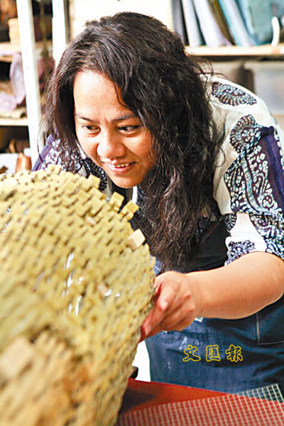 ■陳惠蓮利用鐵絲網、紙皮卡及木夾,創作出藝術味濃郁的環保燈飾。