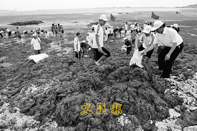30日,一些大學生在青島前海海岸清理滸苔。 6月上旬以來,青島市近海海域開始出現大面積滸苔,最大影響面積達到1.3萬平方公里,實際滸苔覆蓋面積約為400平方公里,對城市景觀和奧帆賽運動員賽前訓練產生了一定的影響。面對突如其來的自然災害,青島全市上下積極行動,社會各界群眾從海上、潮間帶、岸邊進行全方位的打撈清理。目前,每天已有超過萬人、千餘艘各類船隻、數十台裝運機械投入到清理行動中。截至6月28日,清理滸苔數量超過10萬多噸。 新華社