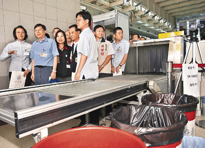 ■陸客來台在即,台灣各機場防疫及安檢相關人員加緊訓練。圖為上月29日,台「行政院長」劉兆玄(中)視察高雄國際機場。