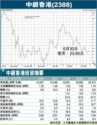 中銀香港(2388)宣布獲得中國銀行 (3988.HK;601;988.SS,優於大市)6.6億歐元 (80.4億港幣)後償貸款。此項貸款將推動中銀香港08年預期資本充足率提升1.3%左右 (07年為13.1%),表明該行生息資產增長強勁(預計08年增長14.9%)。此次後償貸款為期10年,發行後的最初5年之內利率為0.85%+EURIBOR (實際利率為5.975%);如果在發行5年之後尚未提前償還,那麼剩餘期間的利率為1.35%+EURIBOR。我們認為此次貸款利率合理,中銀香港也將通過鞏固資本基礎和擴大生息資產而從中受益。此外,中銀香港以8億港幣出售位於中環的中銀保險大廈,預計將帶來一次性稅後淨收益2.6億港幣。我們調整了盈利預測,並將該股目標價格從23.75港幣上調至24.00港幣(昨收20.65元)。我們對中銀香港維持優於大市評級。我們認為該股派息率較高,具有投資價值。