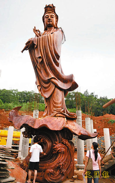 一尊12米高的木雕觀音像(見圖)日前落座泉州少林寺。這尊觀音像由兩根直徑2.5米的非洲菠蘿格紅木雕成,重26噸,造價70多萬元,由泉州木雕大師黃泉福與10名雕刻師歷時1年3個月完成。觀音腳踩荷花,左手持淨瓶,「荷」與「瓶」跟「和平」諧音,因此命名為「和平觀音」。據介紹,該觀音像為目前國內最高,泉州少林寺正考慮為其申請健力士世界紀錄。 ■本報海峽西岸新聞中心記者 張文海