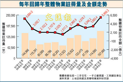 【本報訊】美聯物業首席分析師劉嘉輝表示,剛過去的第11個回歸周年,是回歸以來樓市最旺的一年。據土地註冊處資料顯示,回歸第11年整體物業(包括一二手住宅、一手公營房屋、工商舖及車位)註冊宗數共錄得157,485宗,數字較第10年114,680宗上升37.3%,並首度超越15萬宗,創自回歸後新高(見圖)。