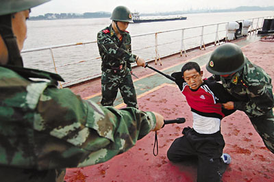 7月3日,南京港邊防檢查人員在演練中抓捕「涉恐人員」。當日,江蘇邊防總隊南京港邊防檢查站聯合長航公安南京分局、南京市海事局等部門在長江航道南京段棲霞錨地舉行水上反恐防爆實戰演練。 新華社