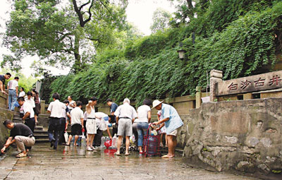 長沙市氣象台於2日發布了今年首個高溫橙色預警。同時,長沙市將面臨三個月的缺電考驗。由於停電,3日上午有很多市民前往白沙井取水。 中新社