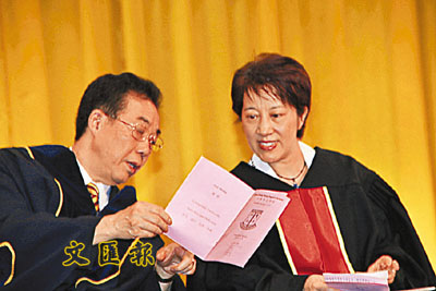 ■中港英文學校董事長蔡國贊(右)與浸大國際學院總監陳寶安(左)出席畢業典禮。 本報記者黃殿晶 攝