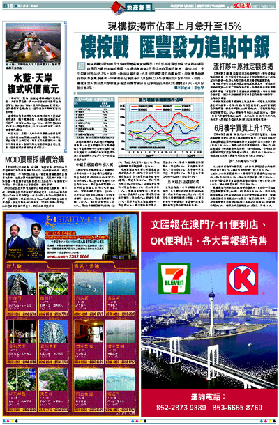 6月份銀行於現樓物業之按揭市佔率排名方面,中銀香港仍佔據首位,市佔率由今月1月份的22.6%放緩至6月份的16%;第二位是恆生銀行,市佔率為15.4%;第三位是匯豐銀行,6月的市佔率由五月的12%擴闊至15%;緊接著是渣打銀行,佔7.9%。至於第5至10位排名分別為:第5位東亞銀行,佔5.9%;第6位星展銀行(香港),佔5%;第7位永亨銀行,佔4.7%;第8位中國建設銀行(亞洲),佔3%;第9位大新銀行,佔2.5%;第10位美國通用金融(香港),佔2.4%。