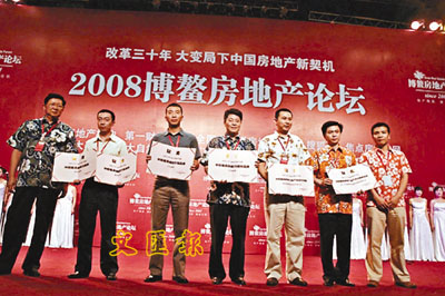 第一太平戴維斯估值及專業顧問有限公司於早前在海南博鰲舉行的2008年博鰲房地產論壇上,榮獲「中國最佳房地產資產評估服務機構」殊榮,第一太平戴維斯房地產評估(北京)有限公司副總經理胡峰(右二)於海南博鰲舉行的2008年博鰲房地產論壇上代表領取「中國最佳房地產資產評估服務機構」獎項。