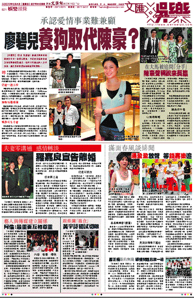 問廖碧兒是否曾哭過,她笑罵記者黐線,不過當問到她是否與陳豪分手?她卻不欲多談,並說:「我跟Moses(陳豪)一向是緋聞男女關係,但大家怎寫我無法控制,總而言之我們繼續是朋友,亦會繼續一起工作。」她又指報道昨日才刊登,所以還未與陳豪溝通過。