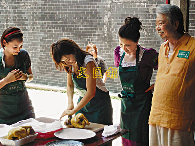 【本報訊】(實習記者 李嘉儀)蔡瀾、蘇玉華、Amanda S.及黃宇詩昨日在上水廖萬石堂拍攝節目《蔡瀾歎名菜》的盆菜場面,黃宇詩更要即席表演切雞,蘇玉華則從旁協助及指導。雖然切雞場面緊張,蔡瀾則笑說:「看的人比切雞的人仲驚呢!」但黃宇詩最後也能成功把雞切好。事後她表示,這是她初次嘗試切雞,更笑指自己不及蘇玉華、Amanda S.般懂做中菜或西餐,她只會一些家常小菜。