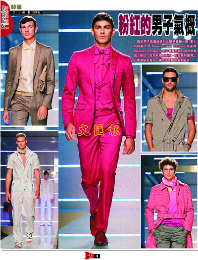 誰說男子氣概統統只此剛硬健碩一類?意大利時裝大師 Massimiliano Giornetti為名牌Salvatore Ferragamo明年春夏男裝的成衣就推出了粉紅、白色和褐色系列,而在質料選擇上以柔軟貼身為主,讓男性更顯俊美和挺拔。
