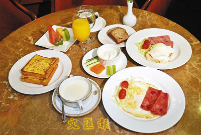 ■台北市政府觀光局五日早晨在圓山飯店以「經典蔣夫人早午餐」宴請大陸「廣之旅」首發團旅客。這份特別的養生早餐包括了高纖果汁、溫順潤喉的杏仁茶以及蔬菜條優格、美式煎蛋、高纖土司、蛋糕與新鮮水果,最後送上一杯無咖啡因的咖啡。 中央社