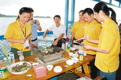 ■直航首發訪澎湖的福建省廈門海滄區青礁慈濟宮保生大帝訪問團,昨日下午乘船至海洋牧場,體驗釣魚和烤蚵仔的樂趣。 中央社