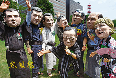 ■日本示威者戴面具,揶揄8名與會領袖。 美聯社