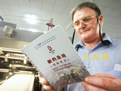 為支持北京奧運,中國基督教兩會出版了《北京2008年奧運會紀念聖經》,方便運動員和遊客閱讀。 路透社