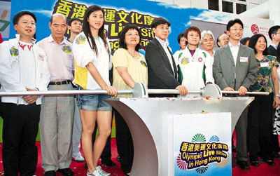 ■尤曾家麗(左四)昨日主持香港奧運文化廣場的啟動儀式。 本報記者聶曉輝 攝