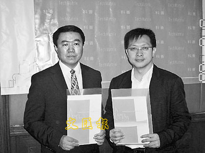 ■「科薈研究中心」發表創新科技政策研究報告。圖為研究主持人科大商學院資訊與系統管理學系教授徐岩(左)與科薈主席譚偉豪。 本報記者孫然 攝