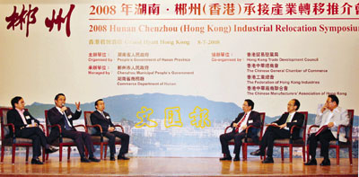 【本報訊】(記者 沈清麗)由湖南省政府主辦、郴州市政府和湖南省商務廳聯合承辦之「福城郴州—2008年湖南.郴州(香港)承接產業轉移推介會」,昨晚在香港君悅酒店宴會廳舉行。今次推介會吸引了逾200名港商出席,郴州市長戴道晉親自解答港商的關注事宜,強調郴州已作好承接沿海產業轉移的平台建設措施。
