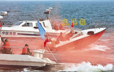 9日,在秦皇島海域舉行的演習中,海警快艇攔截「不法船隻」。當日,河北省公安邊防總隊聯合海軍、海事、漁政等單位在秦皇島海域舉行海上奧運安保演練。 新華社