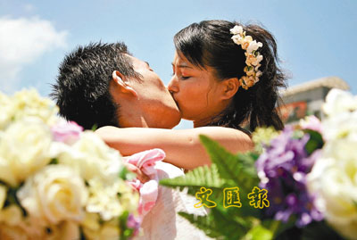 7月7日,一對情侶在黃山翡翠谷參加熱吻比賽,炎熱天氣讓小情侶吻得大汗淋漓。 當日,來自全國各地的200多對情侶相約黃山,遊覽黃山、太平湖,參加趣味熱吻比賽、登黃山大賽、情侶聯合大簽名等活動,體驗盛夏浪漫之旅。 新華社