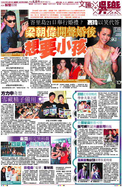 而梁朝偉在台灣宣傳新片,接受TVBS「101高峰會」專訪表示婚禮形式簡單即可,但劉嘉玲喜歡熱鬧,兩人將盡量協調配合。偉仔更罕有地提到婚後想生個小孩,但計劃只生一個,因他對人多會感到害怕,生男、生女順其自然。相信梁媽媽聽到最高興,因為偉仔是家中的唯一男丁。將來他也不會阻止小孩進演藝圈,讓小孩自己選擇,畢竟當年自己的媽媽也是反對他當演員。