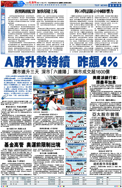【本報上海新聞中心記者凌翔9日電】隨著宏觀環境逐漸趨暖、上市公司中期業績相繼發出盈喜預告,投資者信心開始逐步恢復。加上國際油價大跌,周邊股市重拾升勢,滬深股市今日繼續強勢上攻,雙雙大漲4%左右,滬市已是連續第三天升市,深市更是「六連陽」。上證綜指一舉收復2,900點,深證成指則重返萬點大關。與此同時,成交量也有效放大,今日兩市共成交1,612.39億元(人民幣,下同),較昨日放大兩成。