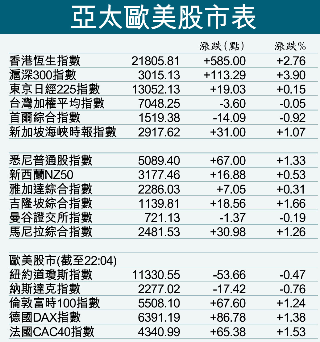 外圍帶動 港股反彈585點 (圖)