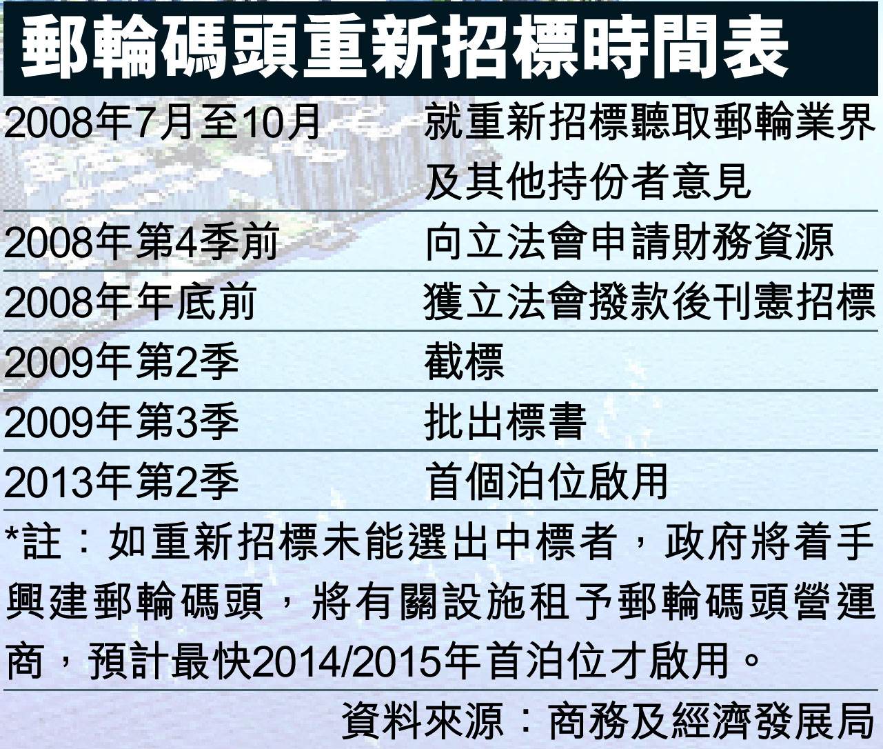 *註:如重新招標未能選出中標者,政府將著手興建郵輪碼頭,將有關設施租予郵輪碼頭營運商,預計最快2014/2015年首泊位才啟用。