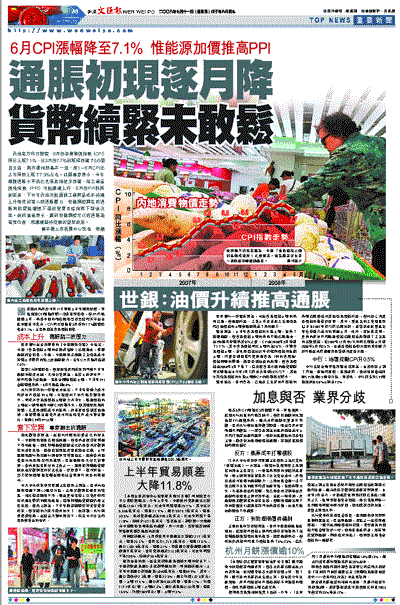 內地官方昨日證實,6月份消費物價指數(CPI)同比上漲7.1%,比5月份7.7%的漲幅回落了0.6個百分點,與市場預期基本一致,而1-6月CPI比去年同期上漲了7.9%左右。此間專家表示,今年整體通脹水平或已見頂並將逐步回落,但工業品價格指數(PPI)可能繼續上升,6月份PPI料再創新高,下半年內地可能面臨工業商品成本持續上升帶來的第二波通脹壓力,宏觀調控需在防通脹和防經濟增速下滑的雙重目標指導下謹慎決策。政府智囊表示,當前宏觀調控尤以防通脹為首要任務,應繼續堅持從緊的貨幣政策。