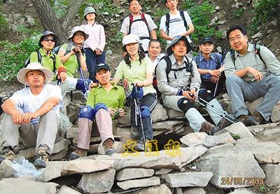 ■楊佳(左一)經常與「驢友」登山。 網上圖片