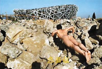 區志航在博客中發出一組名為《景.觀》的「裸體俯臥撐」攝影「作品」。照片中,他在內地不同景觀,以赤身俯臥撐姿式拍下照片,其中最具代表的是在「鳥巢」前的裸體一幕。
