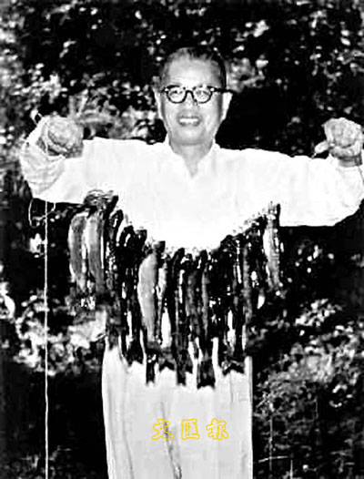 ■史學家通過研究,發現宋子文多外交貢獻,扭轉了其一直以來「賣國賊」的形象。圖為宋子文舉著一串魚,作垂釣豐收狀。 網上圖片