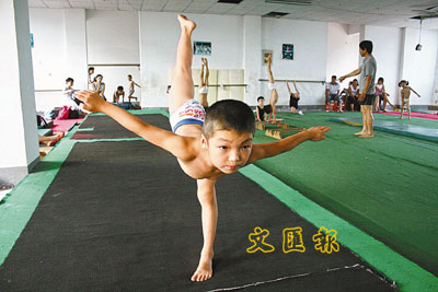 自1992年成立以來,安徽省阜陽市業餘體操隊先後為省和國家體操隊輸送隊員幾十名。 目前,有十多名4歲至9歲的孩子在隊中練體操。圖為一男孩做出一柱擎天的動作。 新華社