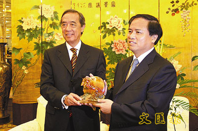 ■港交所主席夏佳理(左)與廈門市長劉賜貴交換禮物。 本報記者武毅田 攝