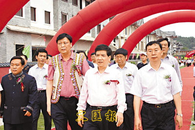 ■「七彩雲南香港行」的成功舉辦,使更多的港商參與雲南旅遊投資。圖為雲南省省長秦光榮(前排右2)視察港資參與建設的彝族文化大觀園項目。 本報記者和向紅 攝