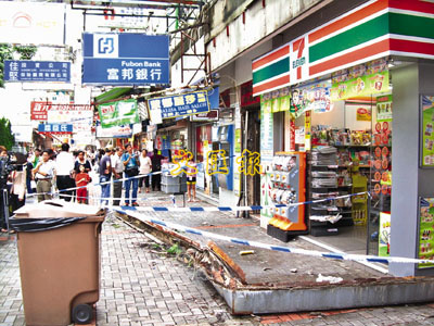 該條L形排水槽疑因日久失修,鋅鐵嚴重鏽蝕,加上連綿天雨增加負荷,昨凌晨3時許,整條排水槽在大雨中突然鬆脫,飛墮到地下一間便利店門外行人路上,部分石屎碎裂四彈,幸時值深宵並無行人途經,否則必定造成傷亡。便利店內兩名職員及兩名顧客驚聞店外巨響,走出查看發現,20歲姓劉職員立即報案。