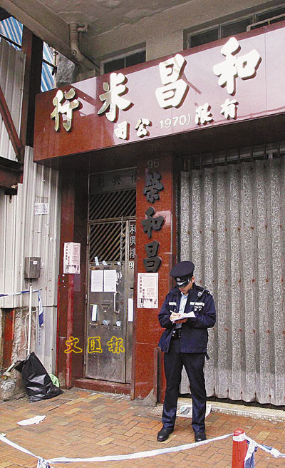 ■利興樓地下的米行獲准每日開門營業數小時。圖為警員在現場巡查。本報記者溫瑞麟 攝