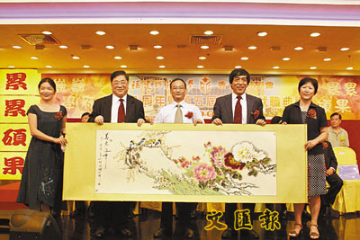 ■郭紹生(中)代表母校致贈一幅吉祥如意牡丹圖予香港校友會,理事長林民盾(右二)、監事長盧象乾(左二)代表接受。