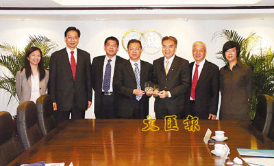 ■廠商會副會長黃友嘉(右三)致送紀念品予廣東省工商業聯合會副主席盧小周(中)。